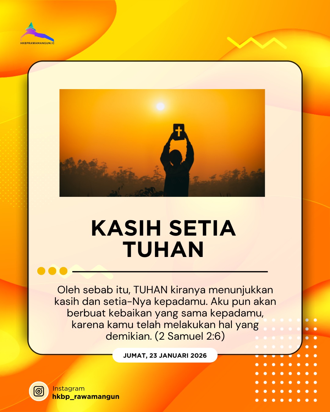 Sahabat Ikutlah Aku yang dikasihi Tuhan Yesus! Firman Tuhan yang menjadi pegangan kita hari ini, yaitu 2 Samuel 2:6, merupakan ungkapan doa sekaligus teladan dari Daud tentang bagaimana kasih setia Tuhan seharusnya tercermin dalam tindakan kita kepada sesama. Ayat ini muncul ketika Daud menghargai kesetiaan orang-orang Yabesh-Gilead yang telah berlaku benar, dan sebagai balasannya Daud mendoakan agar Tuhan sendiri menunjukkan kasih dan setia-Nya kepada mereka. Ayat ini mengajak kita untuk mel...