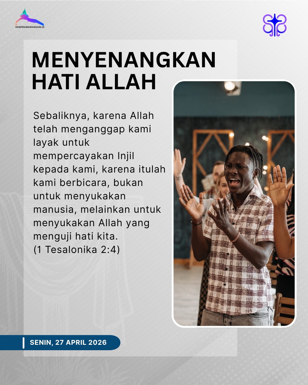 Sahabat Ikutlah Aku yang dikasihi Tuhan Yesus! Sering kali, tanpa sadar, standar hidup kita ditentukan oleh ekspektasi orang di sekitar kita. Kita merasa gagal jika tidak disukai, dan merasa berharga hanya jika dipuji. Namun, Paulus mengingatkan kita akan satu pergeseran fokus yang radikal: tujuan hidup kita adalah menyukakan hati Allah. Paulus menegaskan bahwa kepercayaan yang Tuhan berikan—baik itu tugas, pelayanan, pekerjaan, atau peran dalam keluarga—bukanlah panggung untuk me...